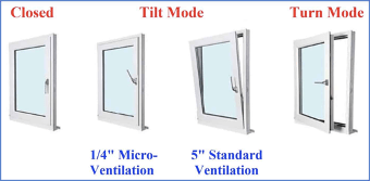 When a TNT window is locked, the handle is straight down. Turn the handle 90 degrees and pull it to open the window on a hinge (TURN). Close the window, point the handle straight up, and you can crack the window – without cracking it, if you know what I mean – to let in a breeze from the top (TILT).